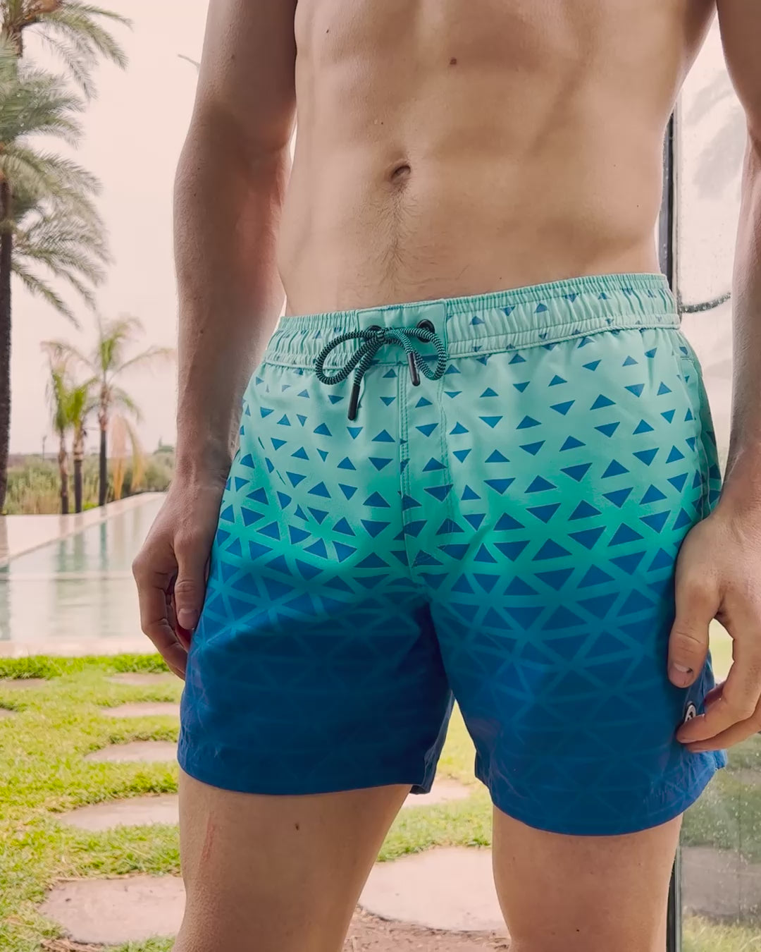 The ombre print affect in these shorts reflects land to water inspired by the beach to sea in the fading light at Agadir, a laid back resort for all beach lovers. This short sits lower at the waist……..
